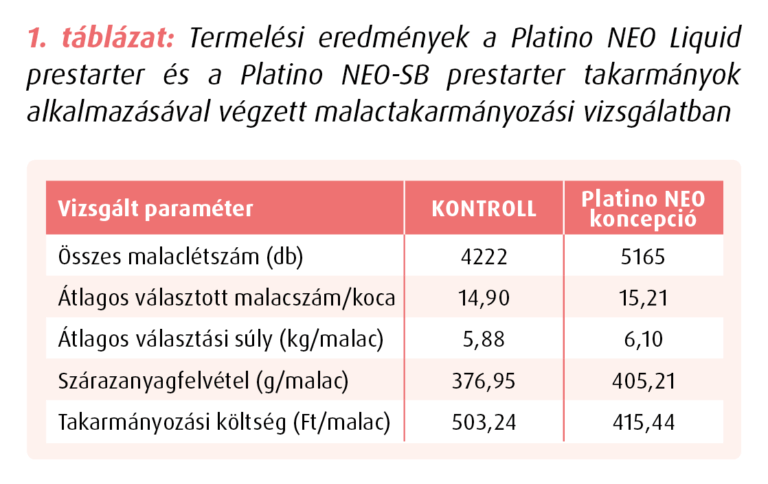 A 2024-től külpiaci értékesítésre kerülő Platino NEO-SB, valamint a 2025 szeptemberében bevezetésre kerülő Platino NEO Liquid prestarterünket több partnernél is teszteltük. Egy 7500 kocás telep eredményeit összegzi a 1. táblázat.
