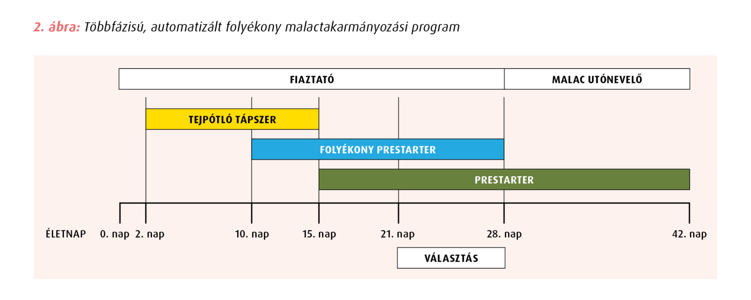 A modern sertéstartásban egyre nagyobb szerepet kapnak az automatizált, folyékony takarmányozási rendszerek, amelyek lehetővé teszik a malacok korai, kiegészítő takarmányozását már a fiaztatón is. A többfázisú, automatizált folyékony takarmányozási rendszerekben (2. ábra) a születést követő első napokban a malacok elsődlegesen a koca tejét fogyasztják, majd a 2. életnaptól a rendszerben kocatejpótló tápszer is bevezetésre kerül. A 10-12. életnaptól a tejpótló után már bevezethető egy olyan folyékony baby/prestarter takarmány, amely a korai kiegészítő takarmányozást szolgálja. Ezt követően, jellemzően a 15. életnaptól, fokozatosan megjelenik a szilárd prestarter takarmány is, amely átmenetet képez a tejalapú táplálás és a későbbi, szilárd fázisú takarmányozás között. A választás a telepi gyakorlattól függően rendszerint ebben az esetben is a 21. és a 28. életnap között történik. A prestarter etetése ezt követően sem szűnik meg, hanem az utónevelés korai szakaszában is fennmarad, jellemzően a 42. életnapig. Ez a fokozatos, többfázisú takarmányozási rendszer lehetővé teszi, hogy a malacok már a fiaztatón hozzászokjanak a kiegészítő takarmányokhoz, miközben a tejalapú és a gabonaalapú táplálás közötti átmenet a lehető legkisebb töréssel valósul meg.