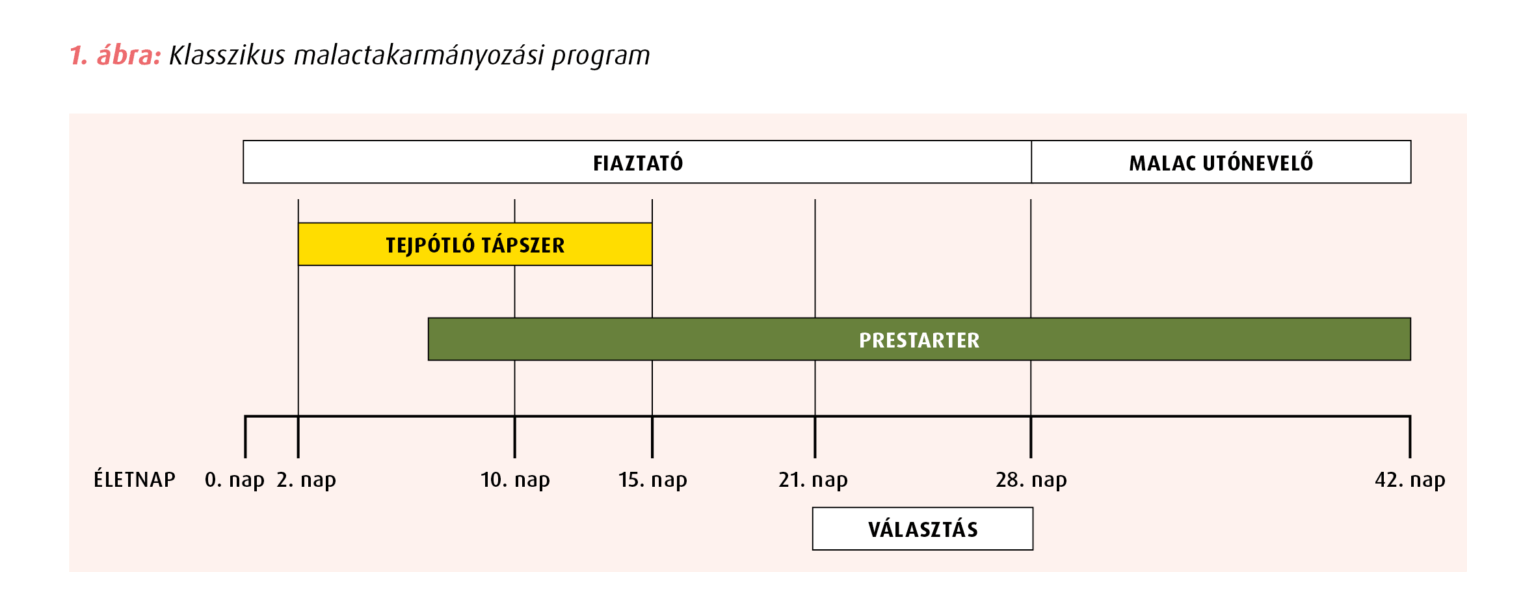 A hagyományos malacnevelés során a malacok a születést követő időszakban elsősorban a koca tejét fogyasztják, ugyanakkor a malacok kiegyensúlyozott táplálóanyag-ellátásának támogatása érdekében a gyakorlatban kocatejpótló tápszerek alkalmazására is sor kerül. A takarmányozási program szerint a tejpor etetése jellemzően 2-3 napos kortól 15 napos korig történik, miközben a szilárd prestarter takarmányok a fiaztatón töltött időszak második felében fokozatosan kerülnek bevezetésre. A 15. életnaptól a malacok a kocatej mellett már kizárólag prestarter takarmányt kapnak. A választás a telepi gyakorlattól függően általában a 21. és a 28. életnap között történik, majd pedig a prestarter etetése az utónevelés korai szakaszában is folytatódik, általában 40-42. életnapig. Ezt követően a battériás nevelés során a takarmányozás fokozatosan starter, majd malacnevelő takarmányokra épül. A folyamatosan ellenőrzött gyártástechnológiával létrehozott Platino Milk Plusz kocatejpótló tápszerhez illeszkedve a fejlesztés során kidolgozott Platino NEO-SB prestarter takarmány a klasszikus malactakarmányozási program (1. ábra) szerves részét képezi, egymásra épülő módon támogatva a korai táplálóanyag-ellátást, valamint a szilárd takarmányok felvételére történő fokozatos rávezetést.